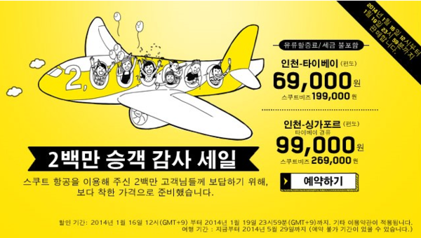 스쿠트 항공은 [200만 승객 감사 세일]의 일환으로 이번 이벤트를 진행하게 됐다고 밝혔다.
