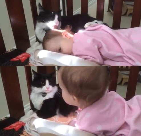 공개된 영상에는 옆으로 누워있는 아기 옆에 앉은 고양이가 아기의 머리를 핥고 있는 모습이 담겨 있다. 그런데 아기가 일어나면 언제 그랬냐는 듯 모른척 다른 곳을 바라보다가 다시 아기가 누우면 머리를 핥아 웃음을 자아낸다