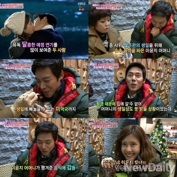 배우 이윤지의 어머니가 한주완에게 생일상을 차려주며 남다른 애정을 과시했다.17일 오전 방송된 KBS 2TV <여유만만>에서는 이윤지의 어머니 정진향 씨가 주말드라마 <왕가네 식구들>에 출연 중인 딸의 촬영장을 깜짝 방문하는 모습이 그려졌다.