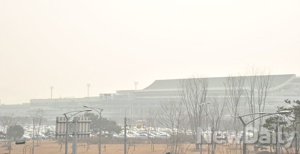 17일 오후 김포공항 하늘이 중국발 미세먼지와 안개로 인해 뿌옇게 흐려져있다.한국 공항공사에따르면, 오늘 오전 안개가 짙게 끼면서 김포공항 주변 시계가 50미터에 붙과, <저시정 경보>가 내려져 있는 상태다.이에따라 오늘 오전 김포공항에서 출발해 제주, 김해,광주, 울산 등으로 가는 항공기 22편이 결항됐으며오전 결향으로 인해 오후 늦게까지 국내선과 국제선 모두 한시간 이상씩 지연 운행 될 것으로 보인다고 밝혔다.