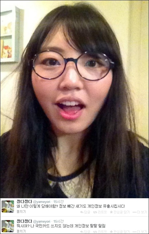 '야매요리' 웹툰작가 정다정이 농협-국민-롯데카드 개인정보 유출 사건에 대해 분노를 표했다.18일 정다정은 자신의 트위터에 "뭐시여? 나 국민카드 쓰지도 않는데 개인정보 탈탈 털림. 왜 나만 이렇게 당해야 함?"이라는 글을 게재했다.이어 그녀는 "정보 뺴간 XX도 개인정보 유출시킵시다"라며 격한 분노를 표해 눈길을 끌었다.앞서 지난 8일 검찰은 신용평가사 코리아크레딧뷰로 직원이 국민카드, 롯데카드, 농협카드에서 약 1억 400만 건의 대규모 고객 개인 정보를 유출했다고 밝혀 국민들에게 충격을 안겼다.이번에 유출된 정보로는 이름, 주소, 전화번호, 카드 이용 명세, 대출 및 연체 기록 등이 포함돼 있어 카드 이용자들의 분노가 커지고 있다.한편, 정다정 카드정보 분노 소식을 접한 네티즌들은 "진짜 어이없는 일인거 같다" "맞아 동의한다" "나같아도 열받을 듯" "나도 유출됐는데 열받는다" "나도 분노한다" 등의 반응을 보였다.[사진 출처=정다정 트위터]