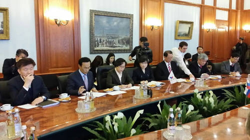 윤진숙 해양수산부 장관(사진 왼쪽)과 막심 스콜로프 러시아 교통부 장관은