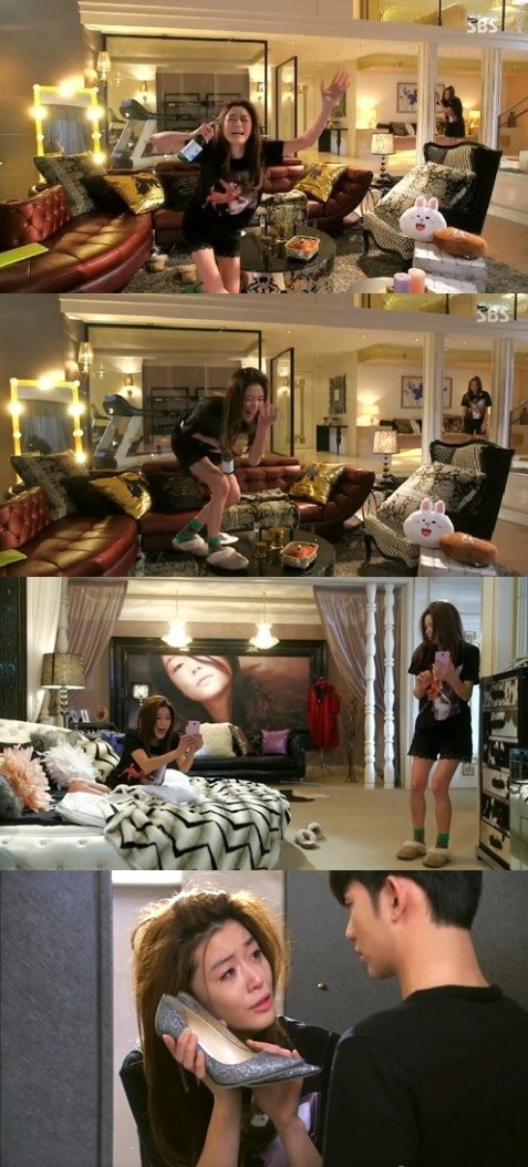 또한, 천송이는 웃다가 이내 다시 엉엉 울기도 하고, 너무 울어 마스카라가 번진 채 급기야 도민준의 집까지 찾아가 진상을 부렸다. 민준을 찾아간 송이는 은색구두를 내밀며 “네가 훔쳐간 내 구두. 좋아했잖아. 몰래 훔쳐 갈 만큼. 이거 너 해. 우리 추억이 담긴 거”라며 주저앉아 울었다.