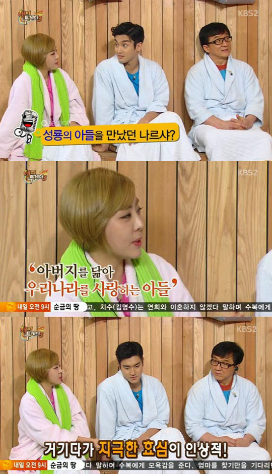 브라운아이드걸스 나르샤가 성룡의 아들에 사심을 드러냈다.23일 방송된 KBS 2TV '해피투게더3'는 '성룡과 친구들' 특집으로 꾸며진 가운데 성룡, 슈퍼주니어 최시원, 브라운아이드걸스 나르샤가 출연해 재치있는 입담을 과시했다.이날 나르샤는 "성룡의 아들을 만난 적이 있다"며 말문을 열었다.이어 그녀는 "굉장히 훈남이더라. 나이도 어리고 매너도 굉장히 좋았다"며 "아빠 옆에서 아빠를 도우며 보필하는 모습이 인상 깊었다. 그때 굉장히 괜찮은 친구라고 생각을 했다"며 남다른 관심을 보였다.특히 나르샤는 "그런데 대화가 안돼서 너무 아쉬웠다"며 안타까운 마음을 내비췄고, 이에 성룡은 "아들은 지금 여자 친구가 없다"며 나르샤에게 좋은 정보를 건네 나르샤를 미소짓게 만들었다.하지만 이어 성룡은 "그런데 아마 내일은 있을 것 같다"고 덧붙여 나르샤를 낙담하게 만들었다.이에 나르샤는 "오늘만 사귀고 헤어져야겠다"고 너스레를 떨어 주변을 폭소케했다.한편, 이날 성룡은 자신의 재산 절반을 기부했다는 사실을 전하며 "죽을 때 은행 잔고가 0원 이어야 한다고 내 자신과 약속했다"는 자신의 생각을 전해 화제를 모았다.[사진 출처=KBS 2TV 해피투게더3 방송화면 캡처]