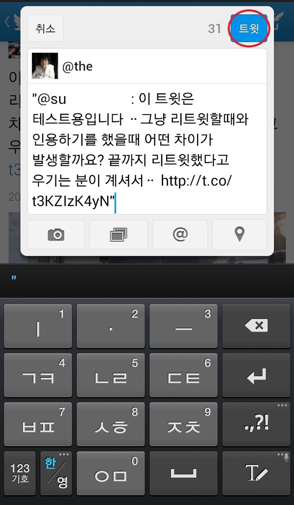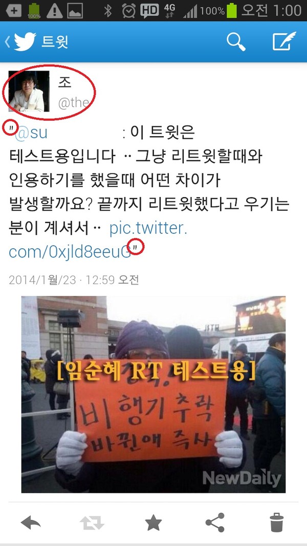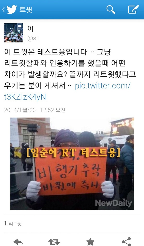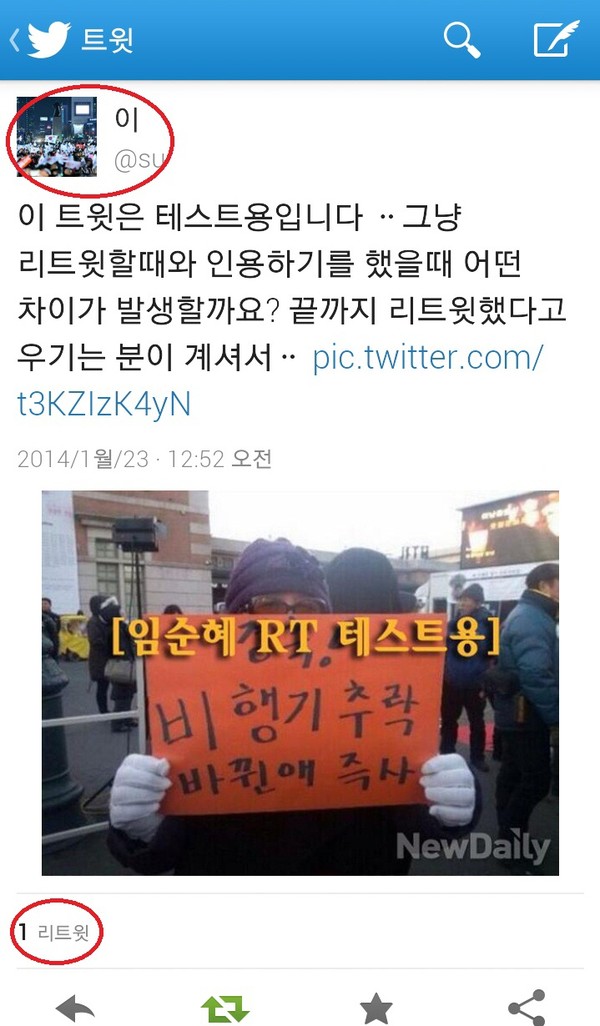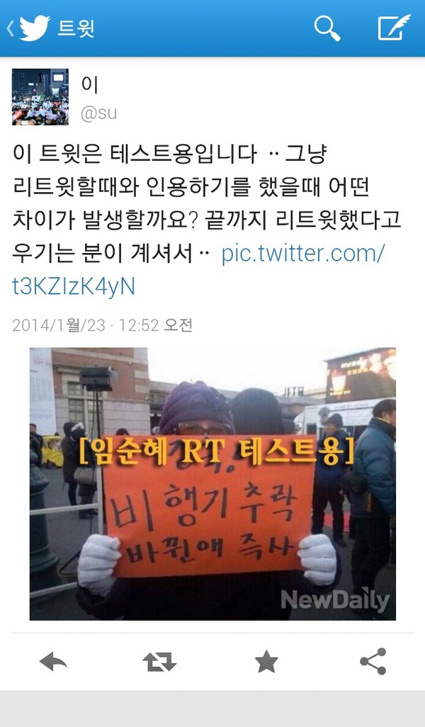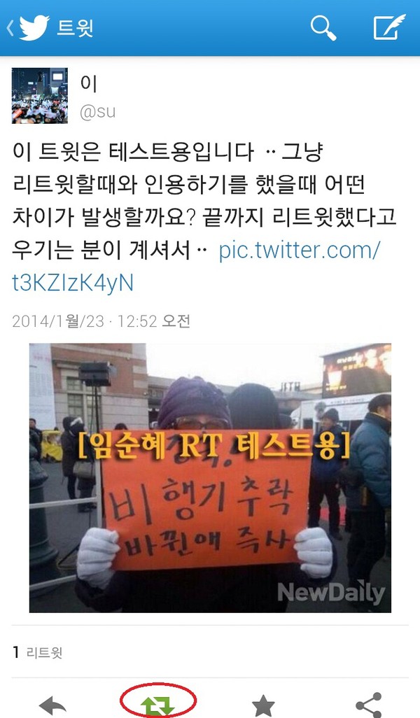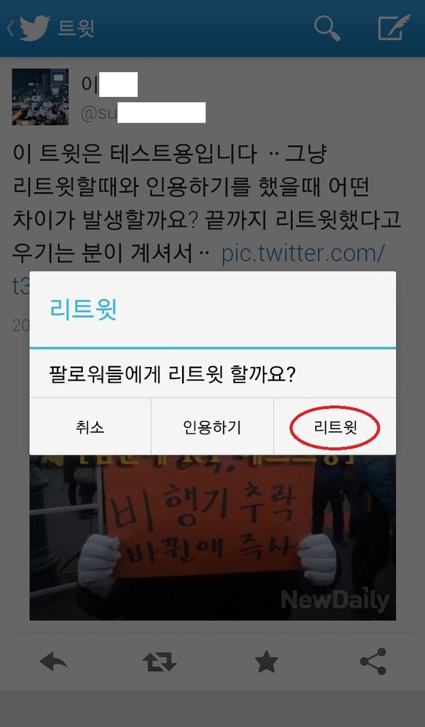 <인용하기> 버튼을 눌렀을 가능성이 높다.<리트윗>과 <인용하기>는 분명한 차이가 있다.