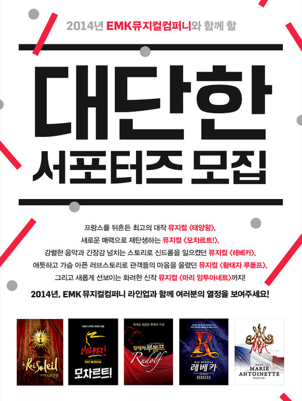 ‘대단한 서포터즈’에게는 배우 인터뷰, 연습실 참관, 백스테이지 체험 등 공연 제작 전반에 대한 경험과 더불어 2014년 EMK뮤지컬컴퍼니의 라인업 작품인 뮤지컬 <태양왕>, <모차르트!>, <레베카>, <황태자 루돌프>, <마리 앙투아네트> 공연관람권과 기념품을 증정한다.