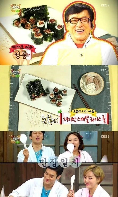 성룡이 선보인 '기찬 김밥'이 야간매점 66호 메뉴로 등극했다.지난 23일 방송된 KBS 2TV '해피투게더3'에 출연한 성룡은 '야간매점' 코너에서 '기찬김밥'을 선보였다.이날 성룡은 한국식 볶음 고추장 김밥을 선보여 시선을 모았다. 성룡의 영문 이름 잭키찬을 이용해 작명된 '기찬 김밥'은 성룡이 한국 스태프들과 같이 자주 해먹었던 음식이라고.'기찬 김밥'은 소고기와 오징어채를 넣고 볶음 고추장에 볶은 뒤 밥에 곁들여 김으로 말아주면 완성되는 간단한 레시피의 야식 요리다.특히 이날 성룡은 '야간매점'을 위해 집에서 직접 만든 볶음 고추장을 가져오는 정성을 보이기도 했다.이후 메뉴 등극을 위해 성룡은 MC들과 다른 출연자들에게 다음 영화에 캐스팅하겠다는 공약을 내걸었고, 결국 만장일치로 '기찬 김밥'은 66호 메뉴로 등극했다.하지만 성룡은 "영화 캐스팅이 아니라 영화 촬영장에 와도 된다는 이야기였다"고 끝까지 농담을 건네 웃음을 선사했다.한편, 성룡 기찬 김밥 소식을 접한 네티즌들은 "맛있겠는데?" "삼각김밥에 소고기고추장맛?" "성룡 아저씨 너무 좋다" "집에서 직접 가져왔다고 했을때 놀랐음" "해먹어 봐야겠다" 등의 반응을 보였다.[사진 출처=KBS 2TV 해피투게더3 방송화면 캡처]
