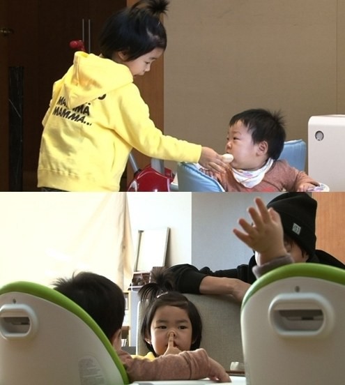 '슈퍼맨이 돌아왔다' 타블로의 딸 이하루가 이휘재의 아들 쌍둥이를 만나 무한애정을 과시했다.최근 설특집으로 진행된 KBS 2TV '해피선데이-슈퍼맨이 돌아왔다' 녹화에서는 타블로의 가족과 이휘재의 가족이 만났다.지난 방송에서 에픽하이 투컷의 돌배기 아들을 만나 의젓한 누나의 모습을 선보인 하루는 쌍둥이 동생을 만나 다시 한 번 누나다운 모습을 선보였다는 후문이다.하루는 이날 처음 만난 서언이와 서준이를 위해 선물로 과자를 준비하는가 하면 쌍둥이가 울음을 터뜨리면 '꼬부랑 할머'니를 열창하며 애쓰는 모습을 보였다고.또 동물 흉내를 내는 등 아기들을 달래기 위해 온갖 노력을 쏟아부었고, 이에 쌍둥이들은 울음을 뚝 그치며 웃음을 지어보여 보는 이들을 흐뭇하게 만들었다.또 늦은 밤 곤히 잠든 쌍둥이를 본 하루는 "동생을 지켜주겠다"고 방으로 찾아와 의젓한 모습을 보이기도 했다고 전해졌다.한편, 하루의 돼지코 개인기 모습이 담긴 '슈퍼맨이 돌아왔다'는 오는 26일 4시 55분에 방송된다.[사진 출처=KBS]