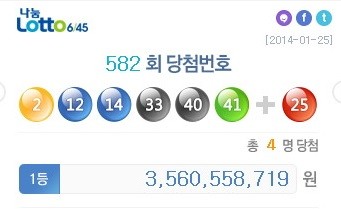 2014년 1월 25일 실시된 제582회 나눔로또 1등 당첨번호는 ‘2, 12, 14, 33, 40, 41’이며, 2등 보너스 번호는 25번이다.