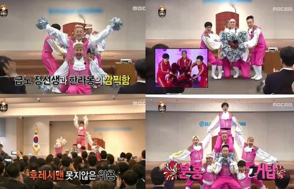 잠시 후 무한도전 응원단이 깜짝 등장하자 임직원들은 깜짝 놀라 일어나 이들을 반겼다. 이에 멤버들은 직원들의 호응을 받으며 큰 실수 없이 응원 동작들을 이어갔다. 특히, 마무리 포즈로 인간 탑을 완성하자 임직원들은 뜨거운 박수를 보냈다.