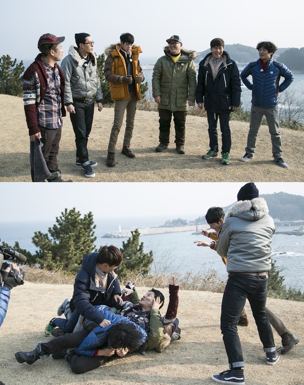 <1박2일> 멤버들이 ‘인간 피라미드’ 사진이 공개됐다.26일 방송되는 KBS 2TV <해피선데이-1박2일 시즌3>(이하 1박2일)은 경상북도 울진으로 ‘남자여행’을 떠난 멤버들의 첫번째 이야기가 그려진다.