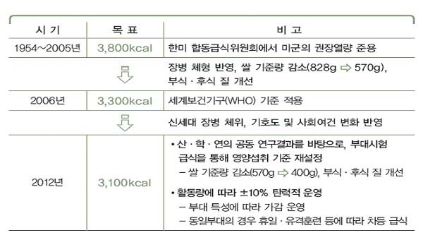 미군 권장열량(3,250kcal)에 가깝게 높이기로 했다.또한 장병들의 [나트륨] 섭취를 줄이기 위해