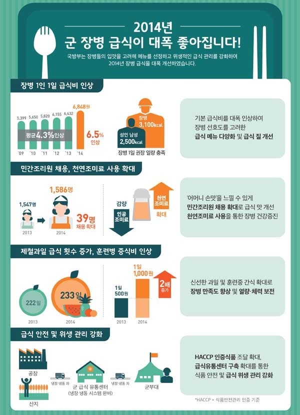 2014년 장병 급식을 대폭 개선한다고 27일 밝혔다.국방부는
