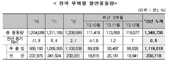 2012년(814만TEU)보다 7.3%(59만TEU) 증가한