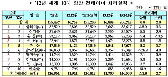 세계 10대 항만의 2013년 컨테이너 물동량은