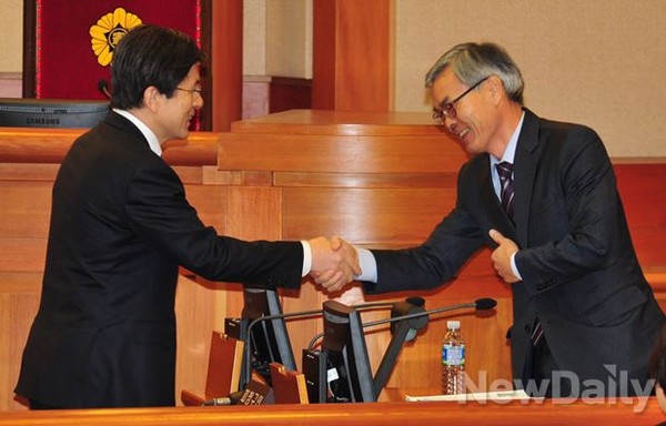 <황교안> 법무부 장관이 28일 오후 서울 종로구 재동 헌법재판소 대심판정에서 열린 [통합진보당의 정당해산심판] 공개변론에 참석해 관계자들과 인사를 나누고 있다.