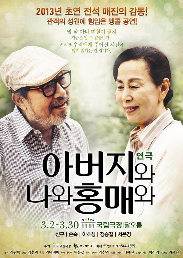 연극 <아버지와 나와 홍매와>가 앙코르 공연을 갖는다.지난해 9월 초연된 연극 <아버지와 나와 홍매와>는 신구, 손숙 두 명의 백전노장과 이호성, 정승길, 서은경 등 실력파 배우들이 열연을 펼치며 매진행렬을 이어간 화제작이다.