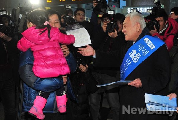 <김한길> 민주당 대표와 당지도부가 29일 서울 용산역 대합실에서 설 귀성객들에게 인사하고 있다.