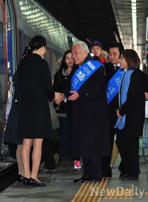[포토]철도 승무원과 인사 나누는 김한길 민주당 대표