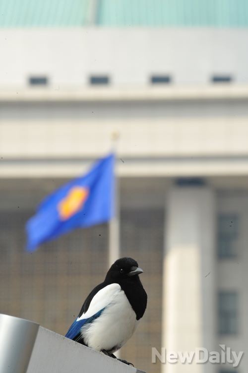 민족의 대명절 설을 앞둔 24일 오후 서울 여의도 국회에서 까치 한 마리가 힘차게 울고 있다.