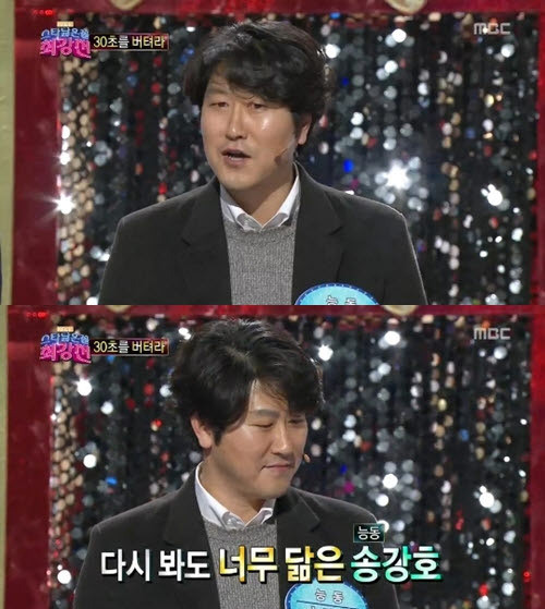 송강호 닮은꼴이 등장했다.지난 30일 방송된 MBC <스타닮은꼴 최강전>에는제각각 스타를 닮은 일반인 출연자들이 등장했다.이중 가장 눈에 띄는 인물은 바로송강호 닮은꼴이었다.그는 능동 송강호란 별명을 가진 41살 직장인 <문종화>씨다.스튜디오는 송강호 닮은꼴인 문종화씨가 등장하자뜨거운 반응을 보였다.송강호와 너무나도 닮아스타 판정단과 방청객마저 놀라워 했다.송강호 닮은꼴인 문종화씨는송강호의 출연작 <변호인>, <관상> 속 연기를어설프지만 열심히 재연해 출연진들의 웃음을 자아냈다.한편 송강호 닮은꼴을 접한 네티즌들은"송강호 닮은꼴, 정말 신기하게 너무 똑같다""송강호 닮은꼴, 친동생 같다""송강호 닮은꼴, 도플갱어다" 등 다양한 반응을 보였다.[사진 = MBC <스타닮은꼴 최강전> 송강호 닮은꼴 캡처]