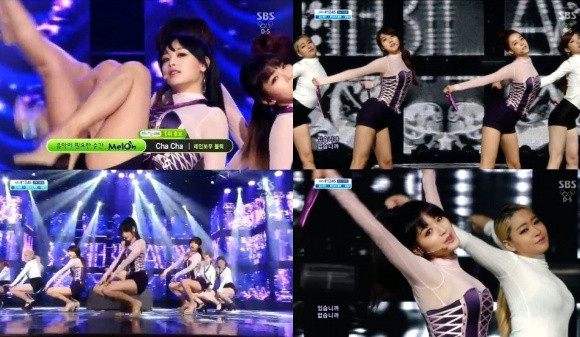 걸그룹 레인보우 블랙(김재경, 고우리, 오승아, 조현영)이 코르셋 의상을 입고 섹시미를 한껏 발산했다.지난 2일 오후 방송된 SBS <인기가요>(MC 황광희 이유비, 스페셜 MC 임시완)에서 레인보우 블랙은 1위 후보에 올라 ‘차차’ 무대를 선보였다.