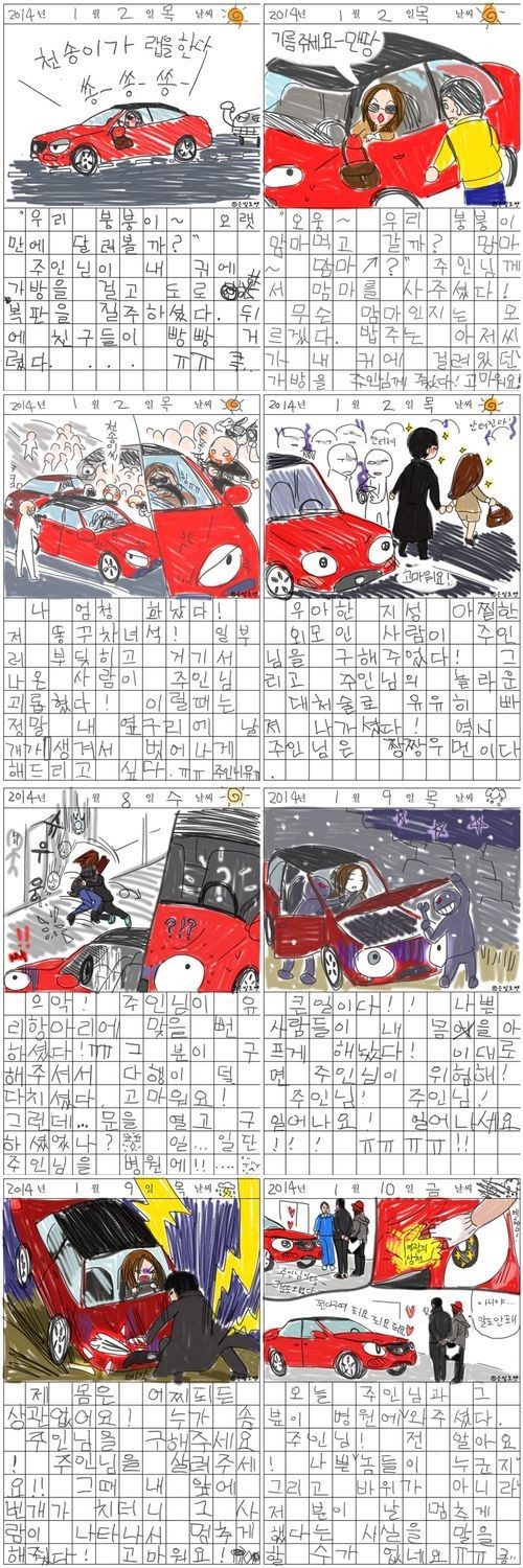 <별그대>의 전지현 애차 ‘붕붕이’가 쓴 일기가 공개됐다.‘붕붕이’는 SBS 수목드라마 <별에서 온 그대>(이하 별그대)에서 극중 천송이 역 전지현이 타고다니는 자동차로, 송이가 한유라(유인영)의 의문사 때문에 소속사의 지원이 끊긴 시점부터 등장했다.