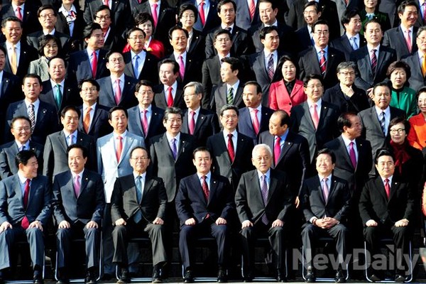제19대 국회의원들이 3일 오후 국회의사당 정현관 앞에서 단체기념사진을 촬영하고 있다. 여야 국회의원들이 함께 단체사진을 찍는 것은 1948년 5월 31일 제헌국회 개원식에서 193인의 국회의원이 단체사진을 촬영한 후 처음이다.