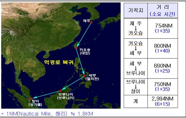 대만 카오슝, 필리핀 세부, 브루나이를 경유해