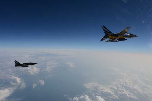 보조 연료탱크 3개를 부착하고 비행 중이다.공군은 <블랙 이글>을 위해