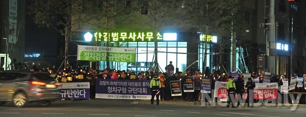내란 음모혐의를 받고 있는 통합진보당 이석기 의원 등 7명의 결심공판이 끝난 3일 늦은 오후, 통합진보당 당원들이 이석기 의원 등 7명이 타고 있는 호송버스를 배웅하기 위해, 수원시 영통구 원천동 수원지방 법원 앞 사거리 도보에서 대기하고 있다.