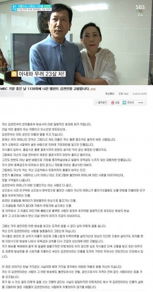 이에 네티즌들은 “김천만 23살 연하 아내 공개 이 글 보니 충격적이다”, “진실이 무엇이든 간에 김천만 너무 하네”, “김천만 23살 연하 아내 방송에서 자랑하고 싶을까?”, “김천만 아들 폭로 얼마나 억울하고 상처가 많았으면…”, “김천만 23살 연하 아내와 행복하나” 등의 반응을 보였다.