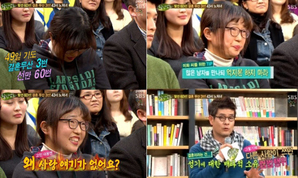 이날 방송에는 결혼하고 싶은 43세 미화씨의 사연이 소개됐다. 그녀는 “선만 60번을 보고 결혼무산만 3번이었다. 49일 기도도 해봤다. 엄마 소원이 저 시집가는 거다. 이대로 늙어죽는 게 아닐지 걱정된다”고 고민을 토로했다.