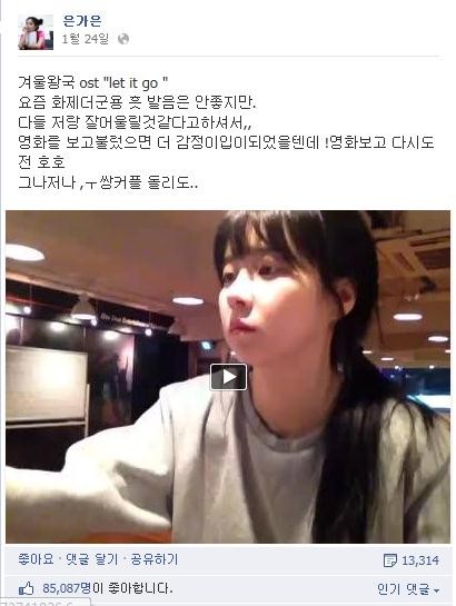디즈니 애니메이션 <겨울왕국> OST를 부른 가수들이 뜨거운 관심을 받고 있는 가운데, 은가은이 부른 ‘Let it go’(렛잇고)가 새삼 주목으 받고 있다.은가은은 지난 1월 24일 자신의 페이스북에 “겨울왕국 OST ‘let it go’ 요즘 화제더군요. 흣 발음은 안 좋지만. 다들 저랑 잘 어울릴 것 같다고 하셔서. 영화를 보고 불렀으면 더 감정 이입이 됐을 텐데 영화보고 다시 도전 호호”라는 글과 함께 영상을 게재했다.