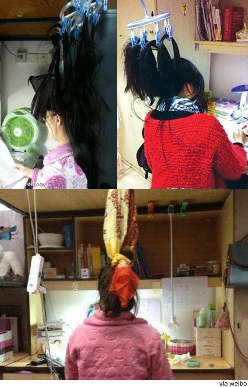 사진 속 대학생들은 공부에 열중하고 있는 모습이다. 특히 눈길을 끄는 모습은 잠을 쫓기 위해 '빨래 건조대'를 천장에 설치한 후, 집게에 자신의 머리카락을 묶어놨다.