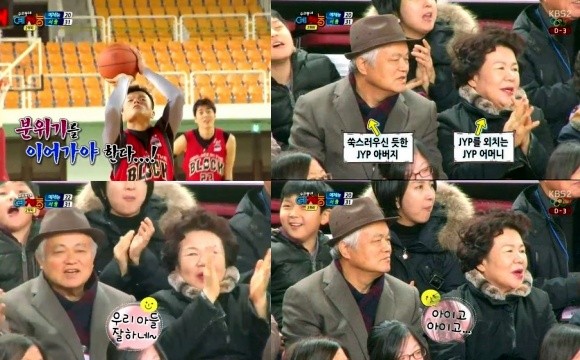 이날 <예체능> 팀은 20대 31로 뒤지고 있는 상황에서 박진영에게 자유투의 기회가 주어졌고, 관중석의 팬들을 박진영을 향해 “JYP”를 외쳤다. 이때 관중석에 경기를 지켜보던 박진영 부모님의 모습이 포착됐다.