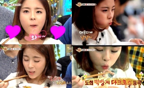 도희가 먹방돌에 등극했다.걸스데이의 혜리-소진, 타이니지의 도희, B1A4는 지난 8일 방송된 SBS <놀라운 대회 스타킹>(이하 스타킹)에서 키조개, 대형 해물찜 등의 음식들을 앞에 두고 먹방을 펼쳤다.