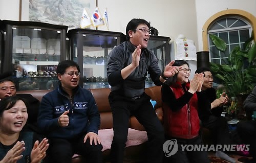 모태범 선수가 10일(한국시간) 저녁 2014 소치 동계올림픽 스피드스케이팅 남자 500m 1차전에 출전하자 경기도 포천시 소흘읍 자택에서 모 선수의 아버지 모영열(가운데) 씨와 가족들이 열띤 응원을 펼치고 있다.