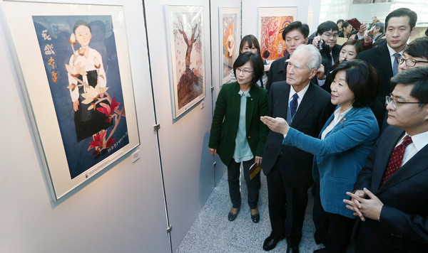전시장을 방문해 위안부 피해자들의 작품을 감상하고 있다.