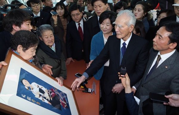 전시장을 방문해 위안부 할머니의 작품을 선물 받고 있다.