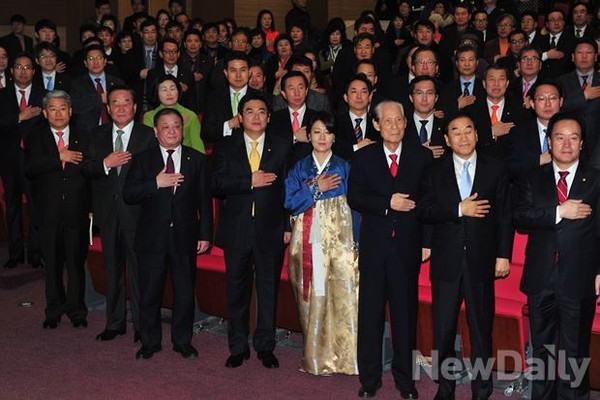 <홍지만> 새누리당 의원이 12일 여의도 국회 의원회관에서 열린 [폴리널리스트] 출판기념회에서 <홍지만>의원 비롯한 참석자들이 국기에 대한 경례를 하고 있다.