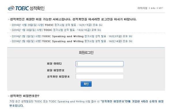 점수확인 비밀번호는 최근 성적발표된 TOEIC 또는