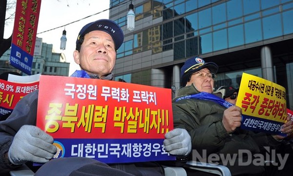 대한민국재향경우회가 <반국가 종북세력 대척결 제 20차 국민대회>를 15일 오후 서울 중구 광화문 동화면세점 앞에서 개최했다.이날 경우회는 국정원무력화 반대 및, 친북 예술활동과 선거철을 맞아 곳곳에서 준동하는 반국가 종북세력 척결을 요구하며,특히 교학사 교과서에 관련해 좌경화된 역사교육을 비판하는 목소리를 높였다.