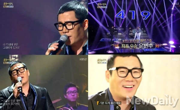 가수 윤민수가 ‘불후의 명곡’에서 첫 출연에 우승을 차지했다.지난 15일 방송된 KBS 2TV ‘불후의 명곡-전설의 노래하다’는 작사가 고(故) 박건호 편으로 꾸며진 가운데, 김종서, 바다, 윤민수, V.O.S, 니엘&백퍼센트, 딕펑스 등이 출연해 선의의 경쟁을 펼쳤다.이날 윤민수는 이룰 수 없는 사랑의 내용을 담은 민해경의 ‘어느 소녀의 사랑이야기’를 특유의 애절한 창법과 절제된 목소리, 20인조 오케스트라와 함께 완벽하게 소화했다.결국 윤민수는 419점을 받아 4연승을 차지하며 우승을 거머주이ㅓㅆ다. 윤민수는 우승 후 제작진과의 인터뷰를 통해 “기분이 되게 좋다. 계속 승을 거두다 보니까 약간 욕심도 나더라”며 소감을 밝혔다.불후 윤민수 우승을 접한 네티즌들은 “불후 윤민수 우승 진심으로 축하합니다”, “첫 출연인데 우승이라니 정말 대단해”, “불후 윤민수 우승 역시 명품 보이스”, “윤후 아빠가 아니라 나는 가수다” ,“불후 윤민수 우승 윤후 보고 있나?” 등의 반응을 보였다.[불후 윤민수 우승, 사진=KBS2 불후의 명곡 방송 캡처]