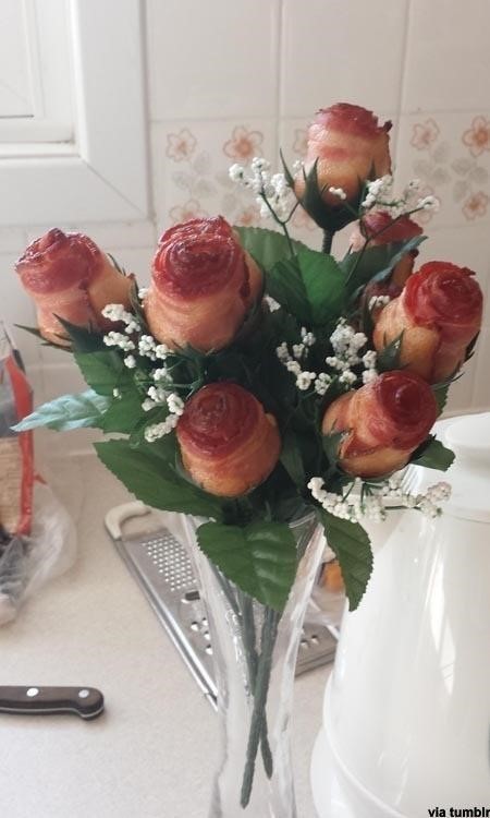 베이컨 꽃다발이 등장했다.한 해외 커뮤니티에는 텀블러에는 [베이컨 꽃다발]이라는 제목으로 한 장의 사진이 올라왔다.공개된 사진에는 얼핏 보면 분홍빛을 띠는 일곱 송이의 장미꽃들이 화병에 꽂혀 있다. 하지만 이 장미는 구운 베이컨을 돌돌 말아 만든 것으로 푸른 잎, 안개꽃 장식과 어우러져 꽃다발로도 손색이 없다.'베이컨 꽃다발'을 접한 네티즌들은 "베이컨 꽃다발 먹을지 말지 고민되겠네", "감탄이 절로 나오는 비주얼', "베이컨 꽃다발 보기 드문 걸작이다", "배고플 때마다 하나씩 뽑아서 먹으면 되겠다", "베이컨 꽃다발 이걸 어떻게 만들었지?" 등의 반응을 보였다.[베이컨 꽃다발, 사진=텀블러]