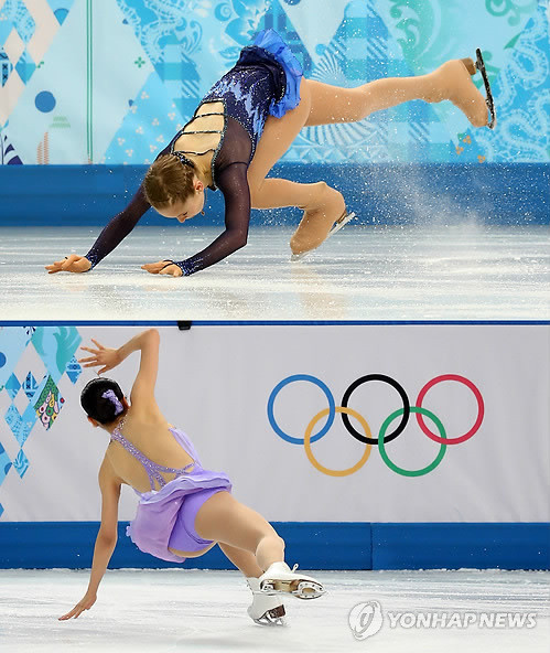 러시아의 율리야 리프니츠카야와 일본의 아사다 마오가 20일 오전(한국시간) 러시아 소치 아이스버그 스케이팅 팰리스에서 열린 2014 소치 동계올림픽 피겨스케이팅 여자 싱글 쇼트프로그램에서 연기를 선보이던 중 넘어지는 실수를 범했다.
