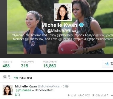'미국 피겨의 전설' 미셸 콴이 김연아의 은메달에 의문점을 제기했다.미셸콴은 21일(이하 한국시간) 김연아의 경기가 끝난 뒤 점수가 공개되고 은메달이 확정된 순간 자신의 트위터를 통해 "믿을 수 없다(Unbelievable!)"라며 당혹스러운 반응을 보였다.평소 김연아의 우상으로 거론된 미셸 콴은 세계선수권대회서 5차례나 우승한 피겨계의 전설로 1998년 나가노 동계올림픽 은메달, 2002년 솔트레이크시티 동계올림픽에서 동메달을 획득했다.앞서 김연아는 이날 러시아 소치의 아이스버그 스케이팅 팰리스서 열린 피겨스케이팅 여자 싱글 프리스케이팅에서 기술점수(TES) 69.69점, 예술점수(PCS) 74.50점으로 합계 144.19점을 받았다.전날 쇼트프로그램의 74.92점을 더한 김연아는 총점 219.11로 러시아의 아델리나 소트니코바(18)가 기록한 224.59점를 넘지 못하며 아쉬운 은메달을 목에 걸었다.