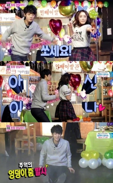 정준영 정유미 커플이 무아지경 막춤 실력을 뽐냈다.22일 방송된 MBC '우리 결혼했어요4'(이하 우결)에서는 2월 생일을 맞은 정준영 정유미의 합동 생일파티 현장이 공개됐다.이날 두 사람은 파티현장으로 개조한 클럽에서 서로의 생일을 자축했고, 이때 DJ가 등장해 축하 음악을 틀었다.정준영 정유미 커플은 1990년대 유행했던 음악이 나오자 스테이지로 나와 커플 막춤을 추며 생일파티를 즐겼다.특히, 정유미는 HOT '캔디'가 나오자 망치춤을 췄고, 정준영은 이에 질세라 엉덩이춤을 비롯해 문희준의 파워레이서 춤 등 정체불명의 막춤을 선보여 웃음을 자아냈다.정준영 정유미 커플 막춤을 접한 네티즌들은 "정준영 정유미 커플 막춤 귀여워", "이 커플 어쩜 좋아", "정준영 정유미 커플 막춤 정말 웃기다", "정준영 의외로 춤을 다 알더라", "정준영 정유미 커플 막춤 완전 신났어!" 등의 반응을 보였다.[정준영 정유미 커플 막춤, 사진=MBC '우결' 방송 캡처]