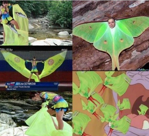 소트니코바의 실망스러운 갈라쇼를 접한 네티즌들은 각종 온라인 커뮤니티 게시판에 깃발을 들고 있는 소트니코바의 모습을 패러디한 여러 가지 사진을 게재했고, 이는 급속도로 각종 SNS를 통해 퍼져나가며 관심을 모으고 있다.