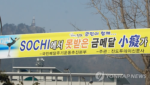 진도군민들의 돈으로 금메달을 제작하겠다는 것.국토 서남단에 자리한전남 진도군에는 이미 곳곳에 현수막을 내걸었다."SOCHI에서 못 받은 금메달, 小癡가 드립니다"인구가 3만4000여 명인 진도군민들이 이 운동을 하게 된 이유는